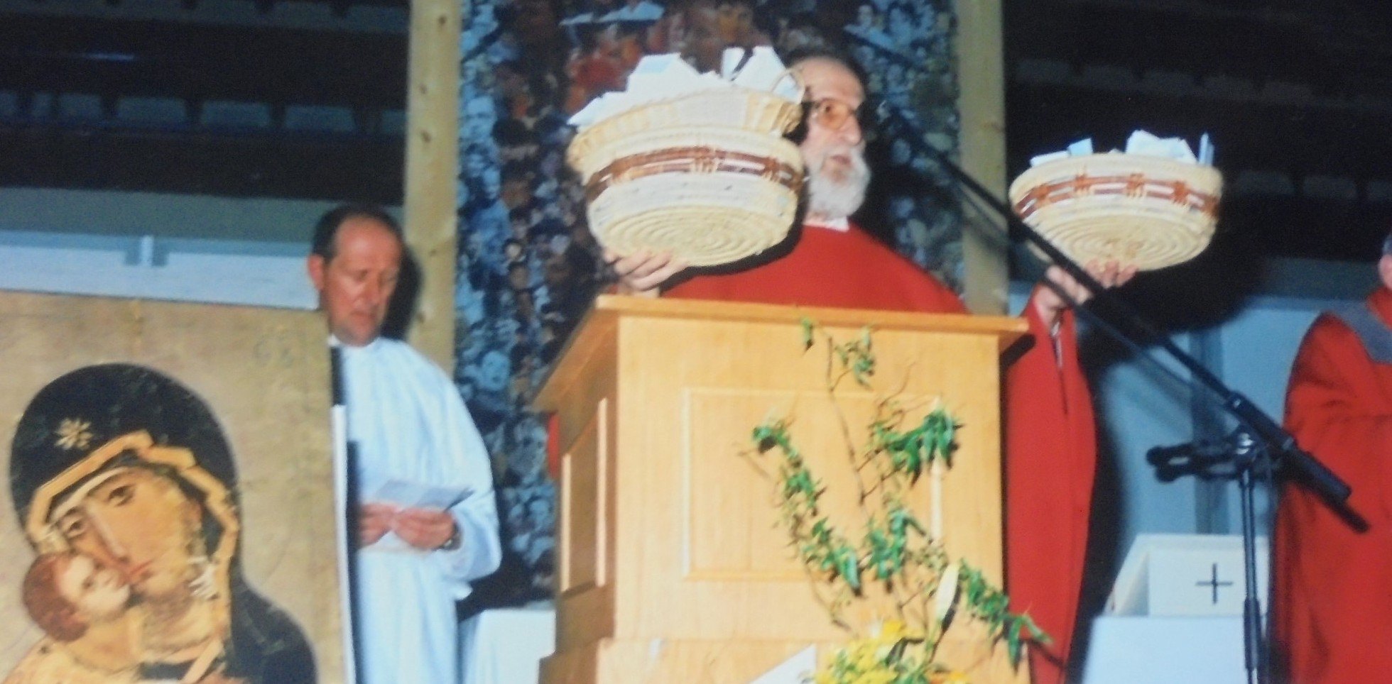 Eucharistieviering Nationale Open Dag 1997, pater Amantius biedt God de voorbedebriefjes aan.