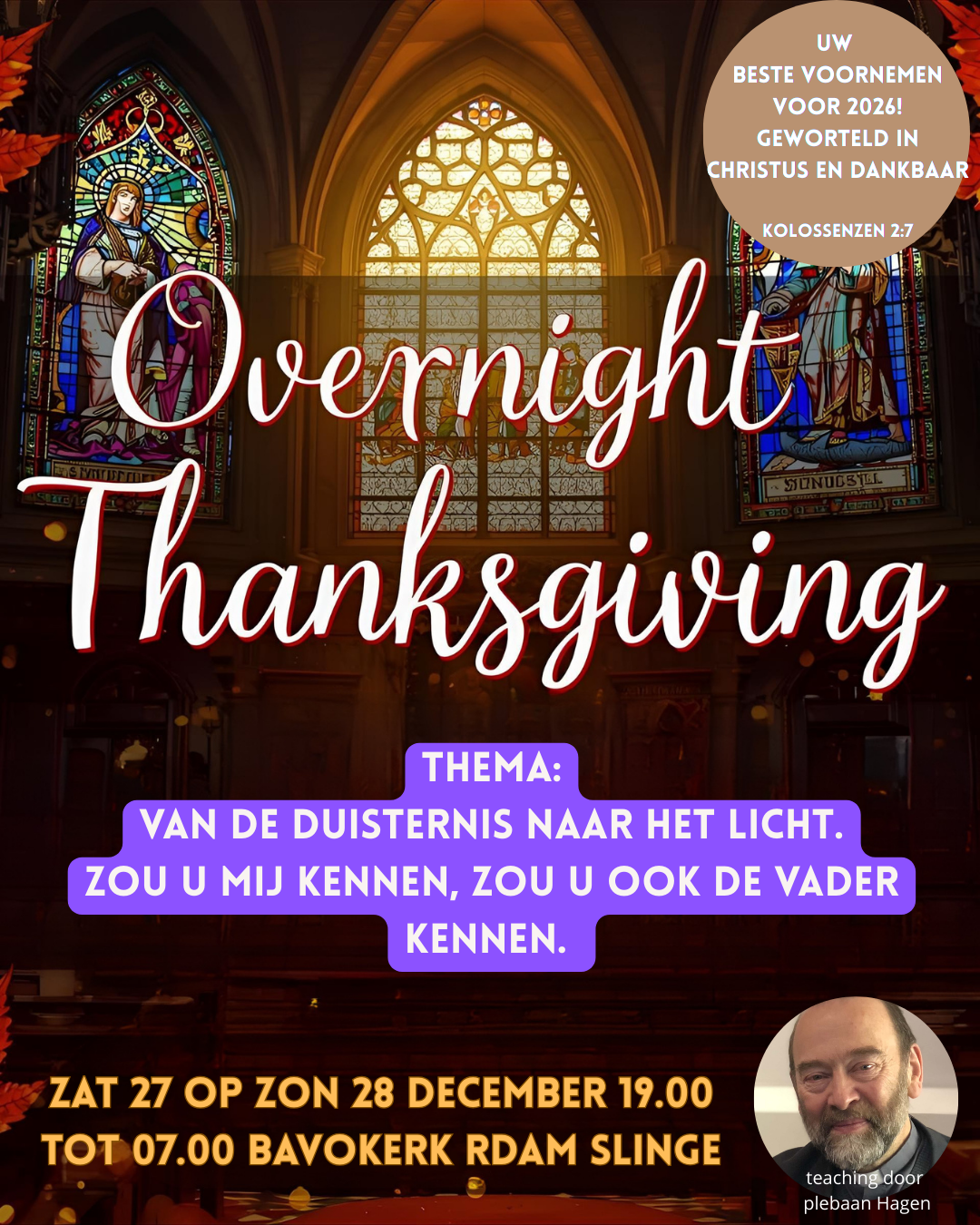 Wij van gebeds-werk- en aanbiddingsgroep Luisterendbidden010 hebben goed nieuws! We sluiten dit jaar 2025 uit pure dankbaarheid af met een Overnight Thanksgiving, want God heeft grote dingen gedaan dit jaar (Luk 1: 46).